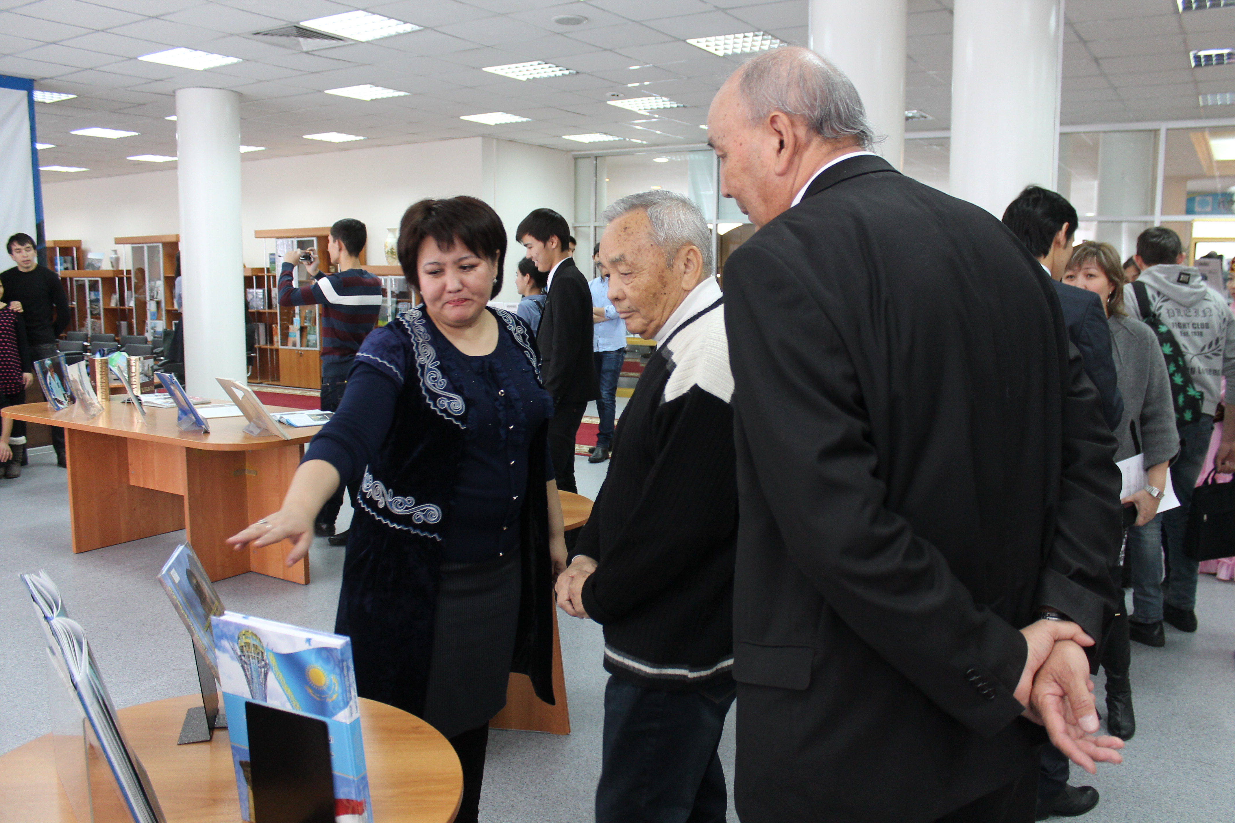 Наши студенты с интересом слушали гида- сотрудницу библиотеки, которая подробно рассказала и показала 7 разделов выставки, где были представлены более 3000 изданий на казахском, русском и английском языках. Уникальность данной выставки заключалась в том, что в ней представлены около 30 статей, охватывающие начало трудовой деятельности ( 1958-1969 гг.) Н.Назарбаева.