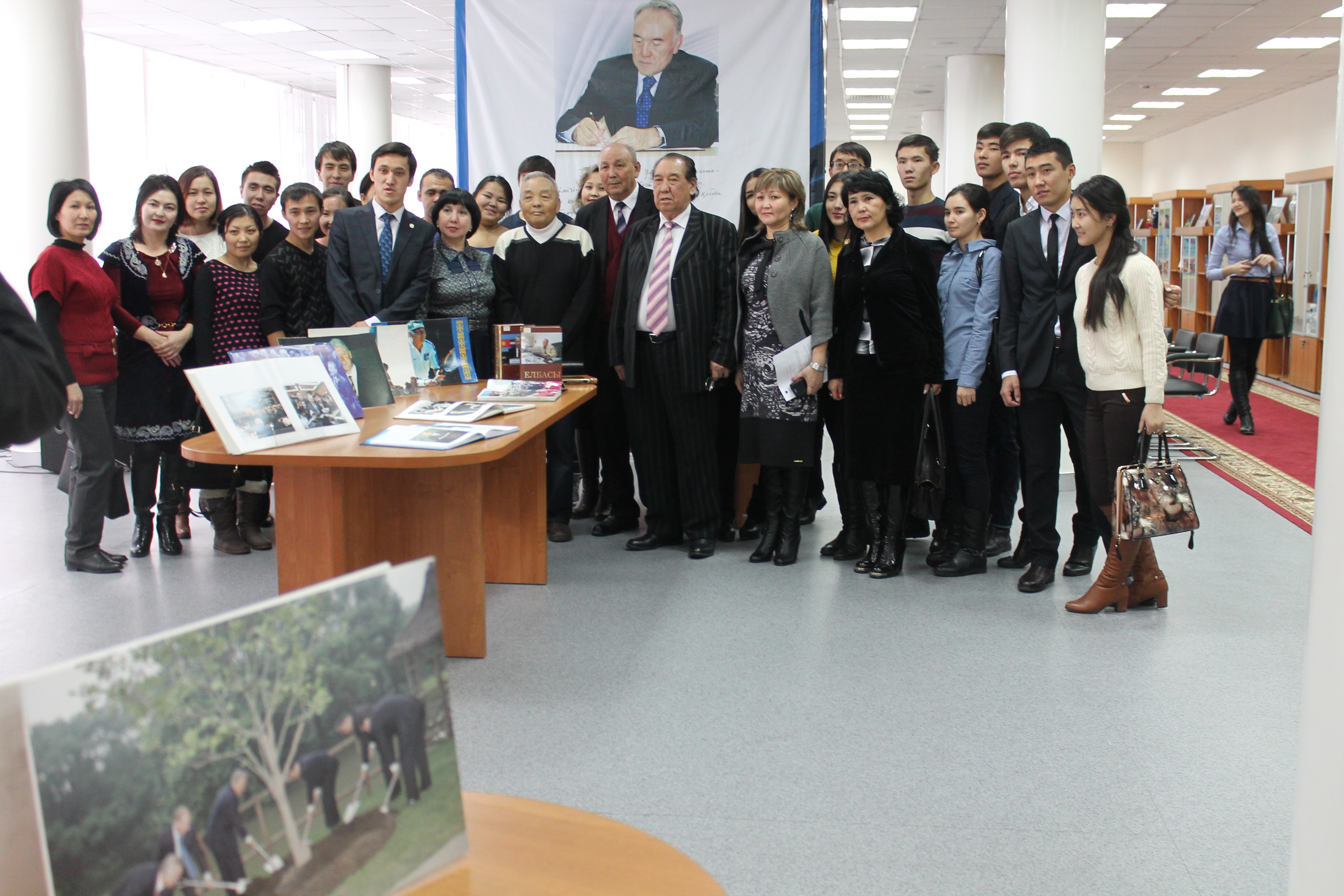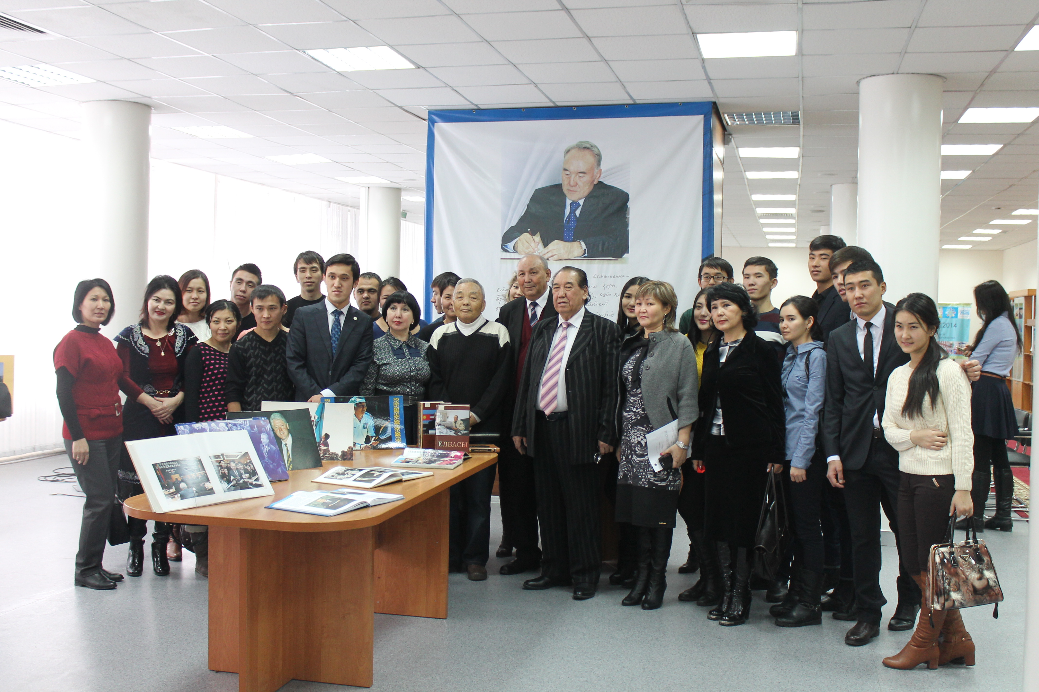 Студенттер осы көрмеден айтарлықтай тәрбиелік пен патриоттық сезіммен шықты, өйткені бұл көрме Тәуелсіз Қазақстанның қалыптасуы жылдарының ерекше шежіресі. Жеті бөлімді көрмеге қазақ, орыс және шет тілдеріндегі 3000-нан астам басылым қойылған. Онда Тұнғыш Президенттің өмір жолы, жастық шағы, еңбекке араласқан жылдары, саяси және қоғамдық қызметі қамтылған. Сонымен қатар, Елбасы туралы әлем саясаткерлерінің ой-пікірлері , ақын – жазушылар шығармаларының топтамаларын студенттеріміз қызығушылықпен көріп шығып, кітапхана қызметкерлерінің әңгімелерін мұқият тыңдап шықты. Біздің 1 курс студенттері зиялы қауым өкілдерімен сұхбаттасып, бірге суретке түсті.