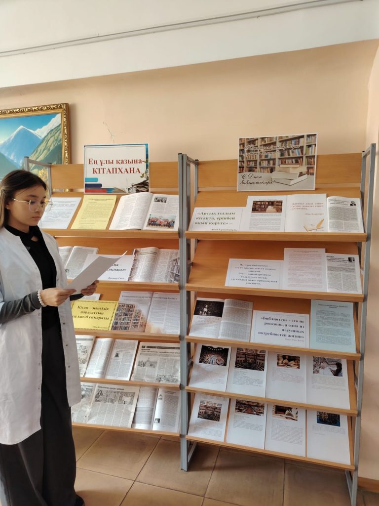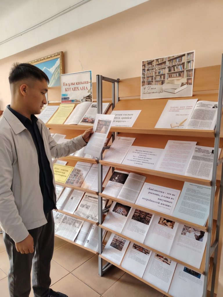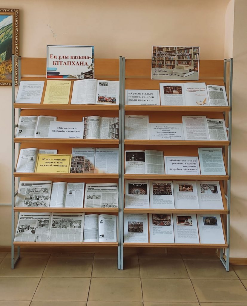 Айтулы күнге орай «Ең ұлы қазына – кітапхана» атты кітап көрмесі ұйымдастырылды. Көрмеде кітапханалар туралы ақпараттар, суреттер, мақалалар көпшілік назарына ұсынылды.