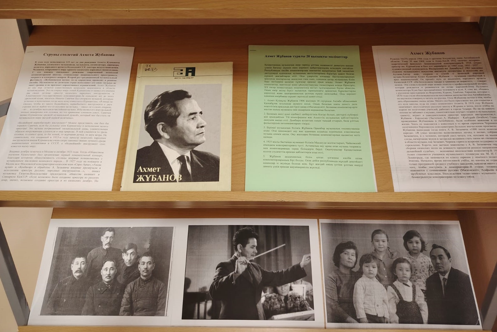 На выставке были представлены книги и научные труды, посвящённые творчеству Ахмета Жубанова, его исследованиям в области казахской народной музыки, а также издания о становлении профессионального музыкального искусства в Казахстане. Особое место занимают биографические материалы, архивные документы и фотографии, отражающие основные этапы его жизни и деятельности.