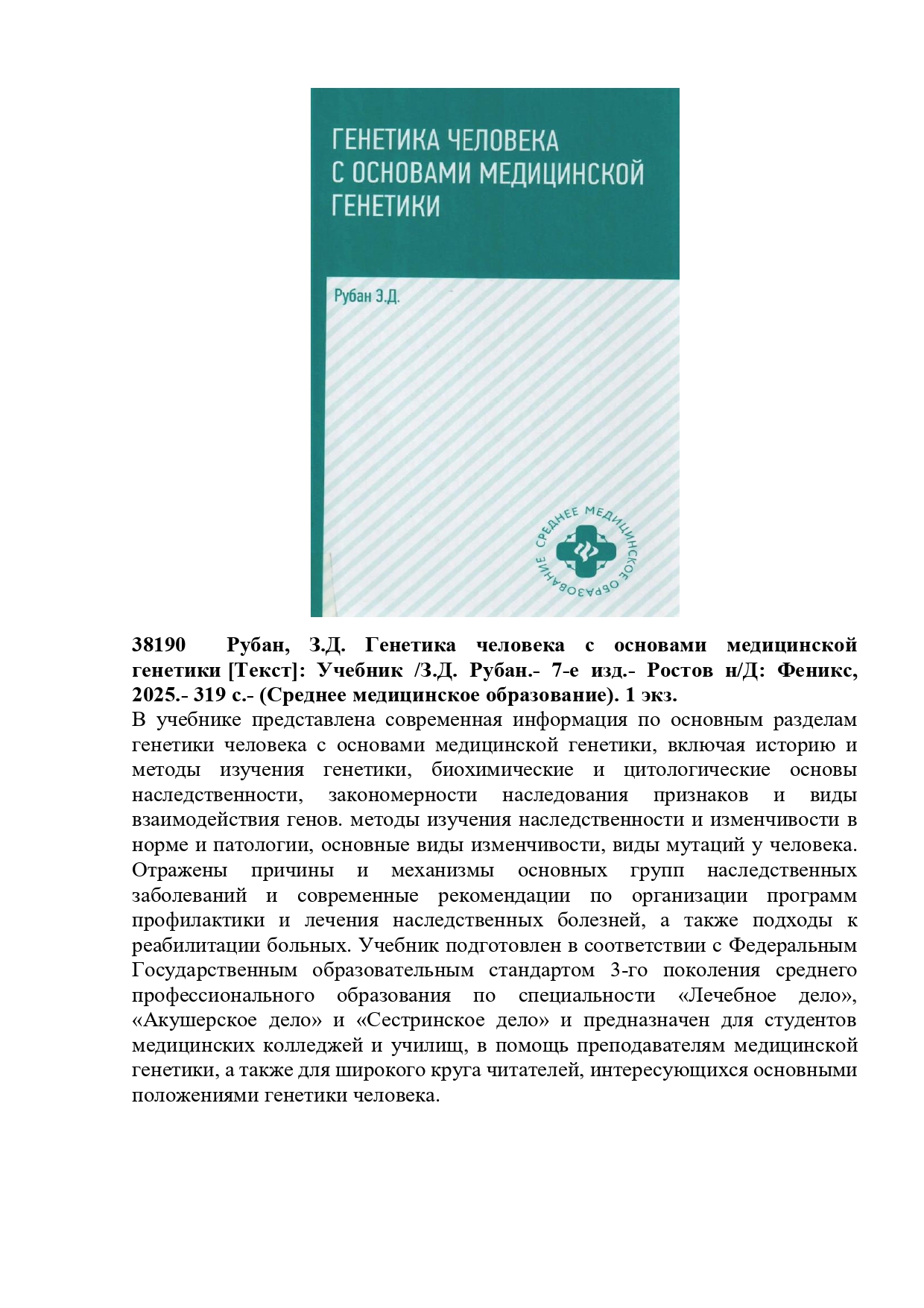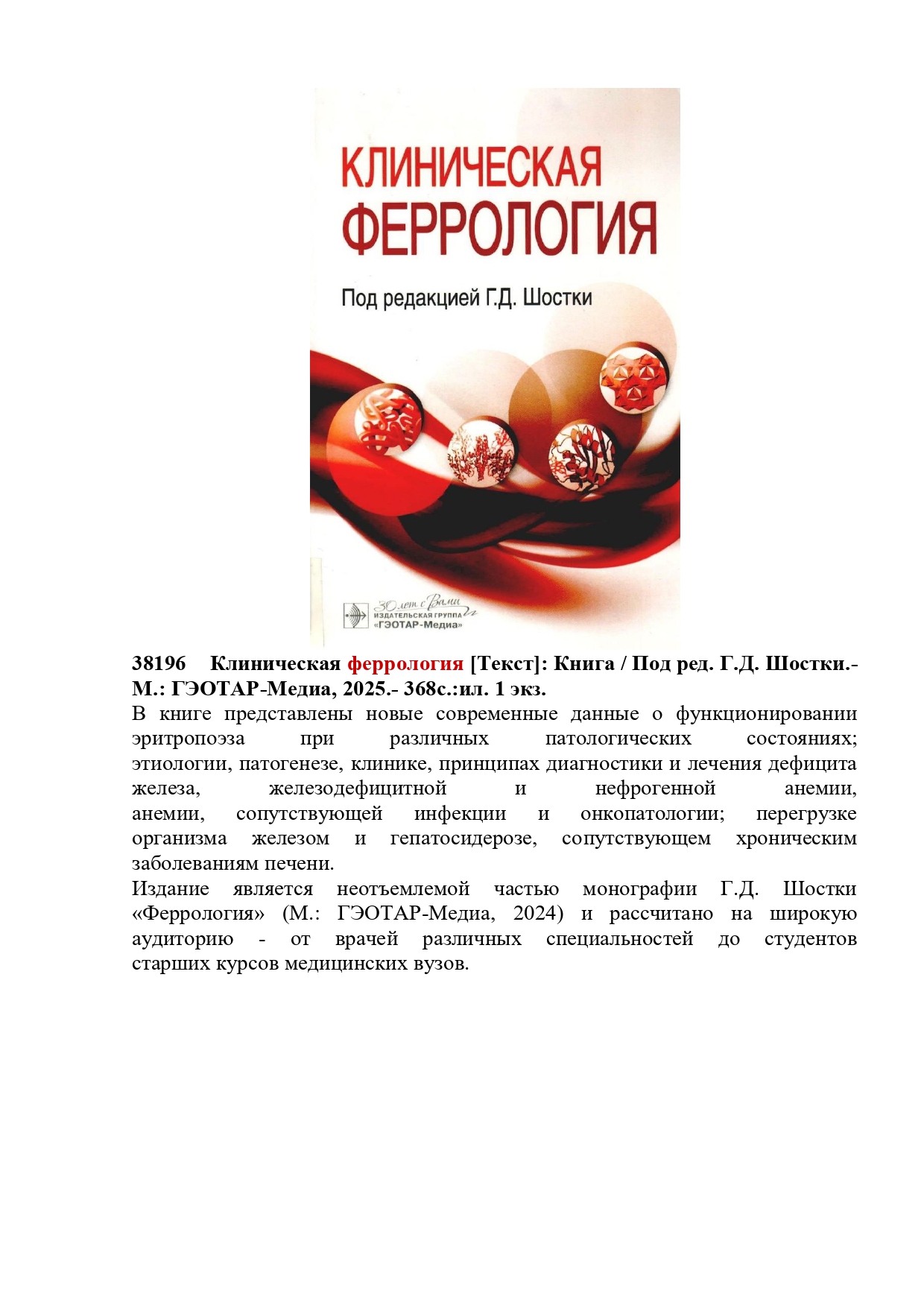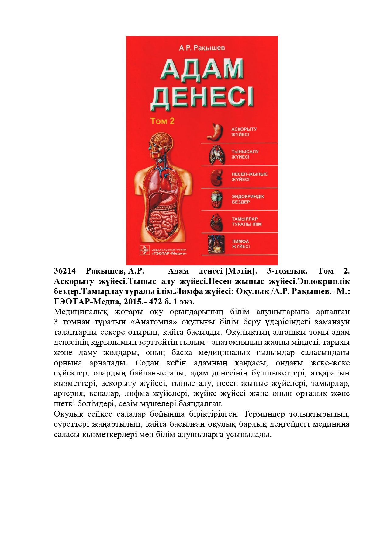 36290 Шарманов, Т.Ш. Маңызды микронутриенттердің рөлі және микронутриенттер тапшылығының алдын алу шаралары туралы: Дәрігерлерге арналған құрал. /Т.Ш. Шарманов, Ш.С. Тәжібаев, И.Г. Цой.- Алматы: Раритет, 2009.- 360б. 1 экз.
