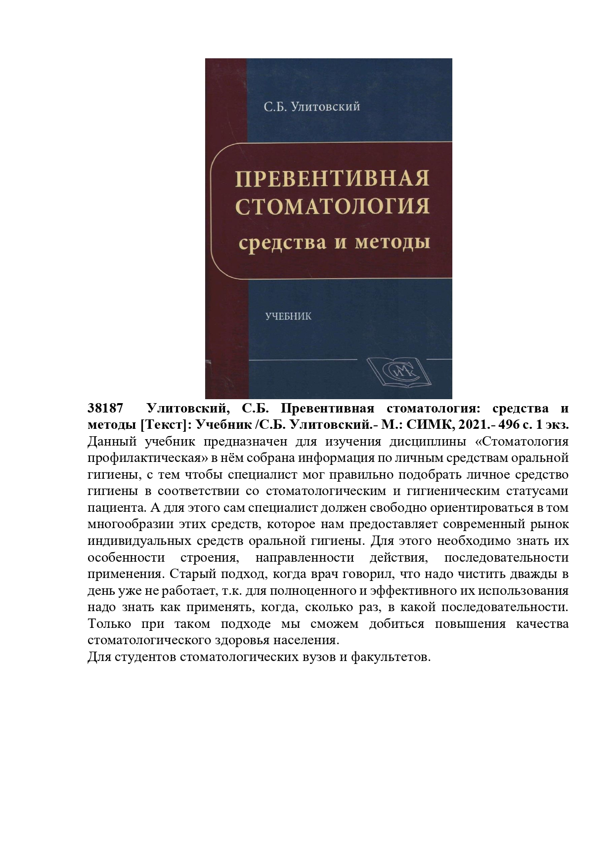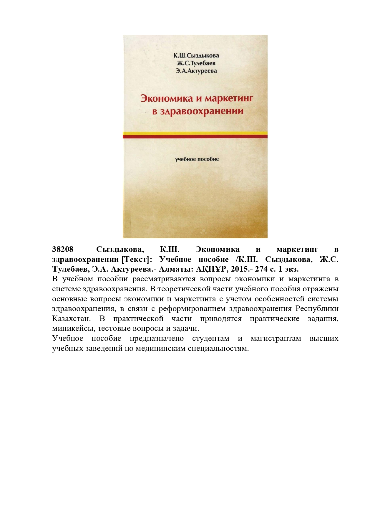 Шарманов Т.Ш. Тағам гигиенасы: Оқу құралы. Құрастырғандар: Быкыбаева С.А., Бужикеева А.Б., Қайнарбаева М.С., Ли М.В., Чуенбекова А.Б., Қожахметова А.Н., Ушанская Е.Ю. – Алматы: «Эверо», 2010. – 212 б. 1 экз. (Сыйға берілген)